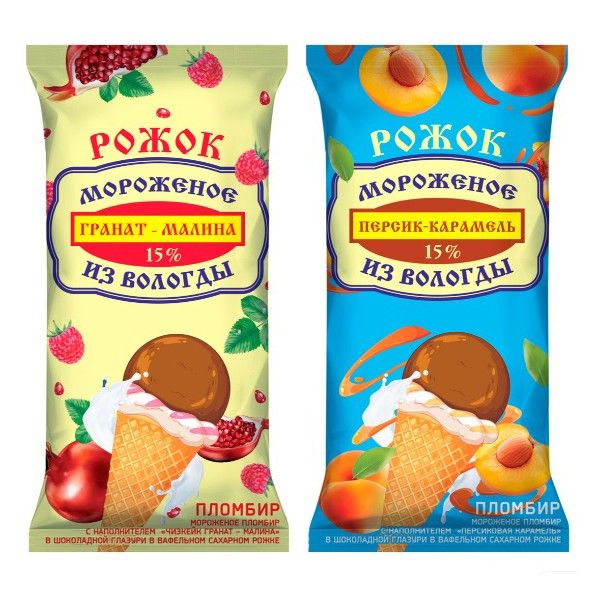 Состав Мороженое в сахарном рожке 20 шт в ассортименте (Пломбир персиковый с карамелью и гранатовое с малиной в сахарном рожке), в любой пропорции.