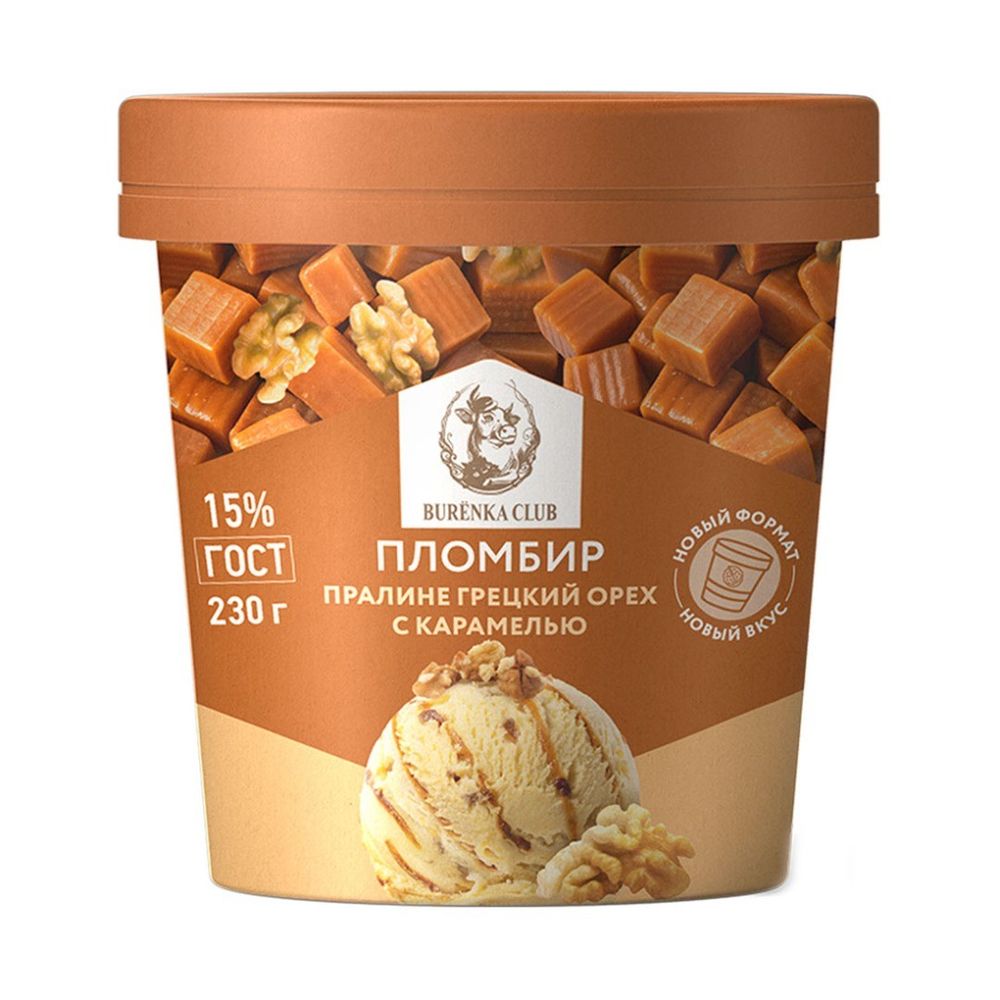 Мороженое пломбир 15% пралине с грецким орехом и карамелью Бурёнка Клаб пинта 230 г, упаковка 8 шт