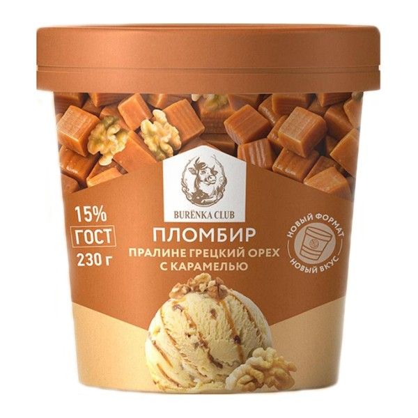 Мороженое пломбир 15% пралине с грецким орехом и карамелью Бурёнка Клаб стакан 230 г, упаковка 8 шт