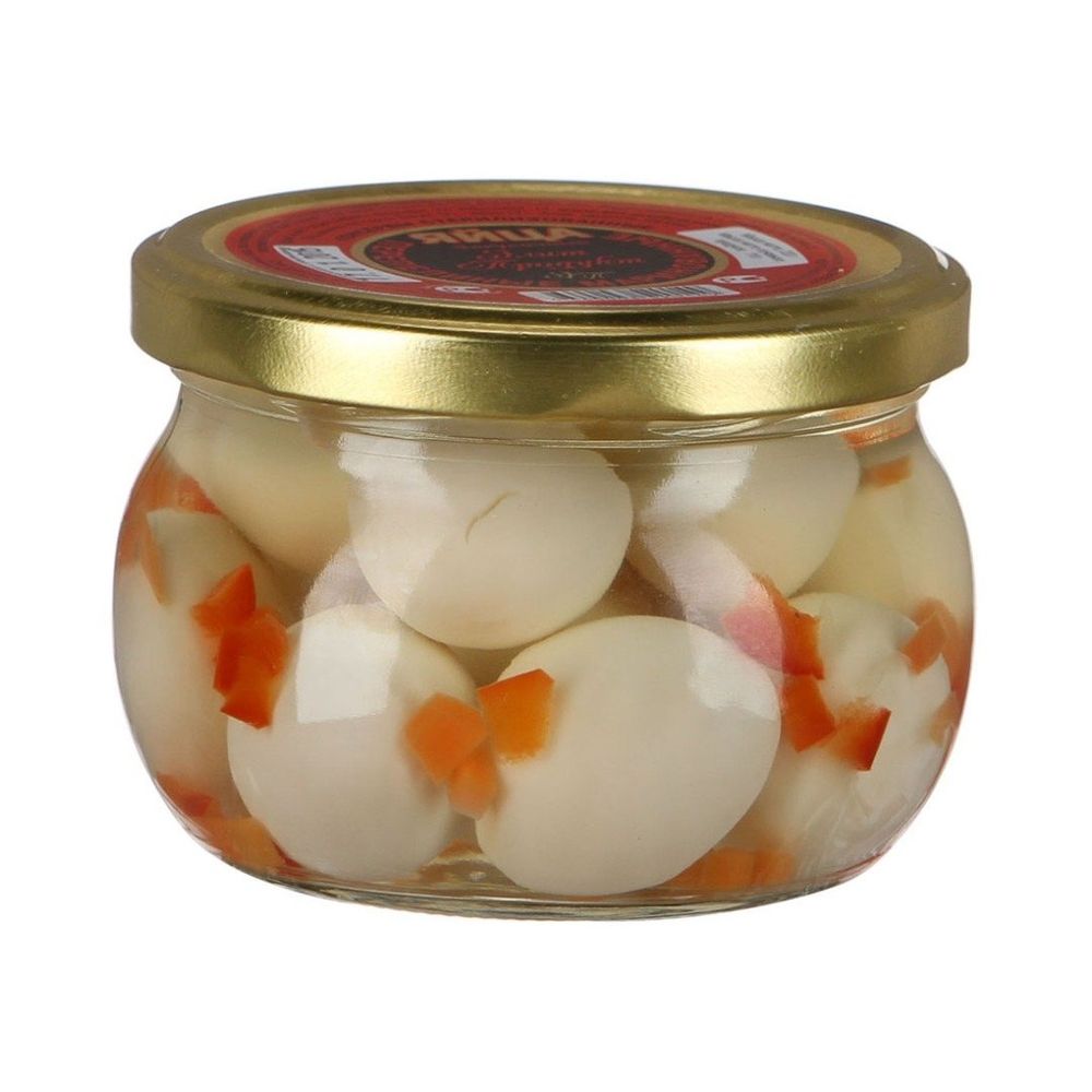 Состав Яйца перепелиные очищенные, перец сладкий свежий, лук столовый свежий, морковь столовая свежая, чеснок столовый свежий , перец душистый горошком, зелень петрушки свежая, лист лавровый. Маринад : соль,сахар, кислота уксусная пищевая.